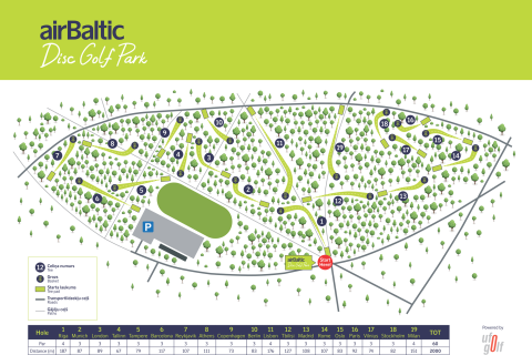 Laukums ir ierīkots parkā/mežā, līdz ar to koki ir daudz un liek saspringt pat pieredzējušiem spēlētājiem. Laukumā ir līdzvērtīgi celiņi gan uz labo pusi, gan uz kreiso pusi un daži taisnie jeb tuneļa celiņi. Izmetiena vietas ir ar mākslīgo zālienu, grozi ir Discatcher Pro.